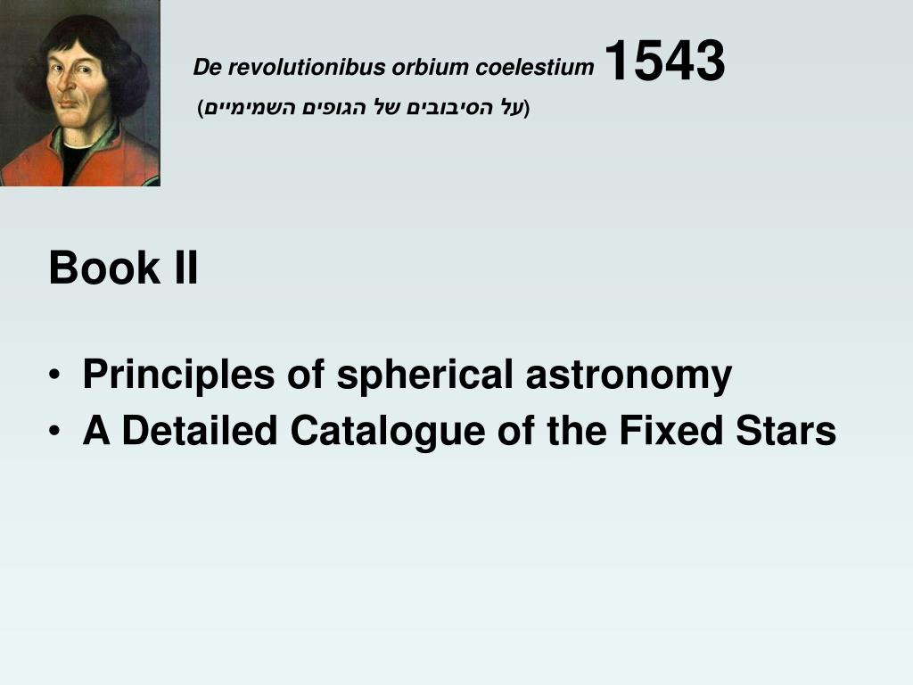 1543 De revolutionibus orbium coelestium(על הסיבובים של הגופים השמימיים) • Book II • Principles of spherical astronomy • A Detailed Catalogue of the Fixed Stars