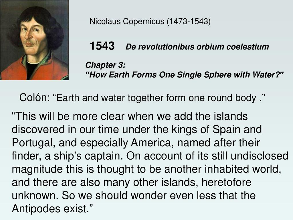 Nicolaus Copernicus (1473-1543) 1543 De revolutionibusorbiumcoelestium Chapter 3: “How Earth Forms One Single Sphere with Water?” • Colón: “Earth and water together form one round body .” • “This will be more clear when we add the islands discovered in our time under the kings of Spain and Portugal, and especially America, named after their finder, a ship’s captain. On account of its still undisclosed magnitude this is thought to be another inhabited world, and there are also many other islands, heretofore unknown. So we should wonder even less that the Antipodes exist.”