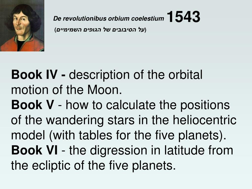 1543 De revolutionibus orbium coelestium(על הסיבובים של הגופים השמימיים) Book IV - description of the orbital motion of the Moon. Book V - how to calculate the positions of the wandering stars in the heliocentric model (with tables for the five planets). Book VI - the digression in latitude from the ecliptic of the five planets.