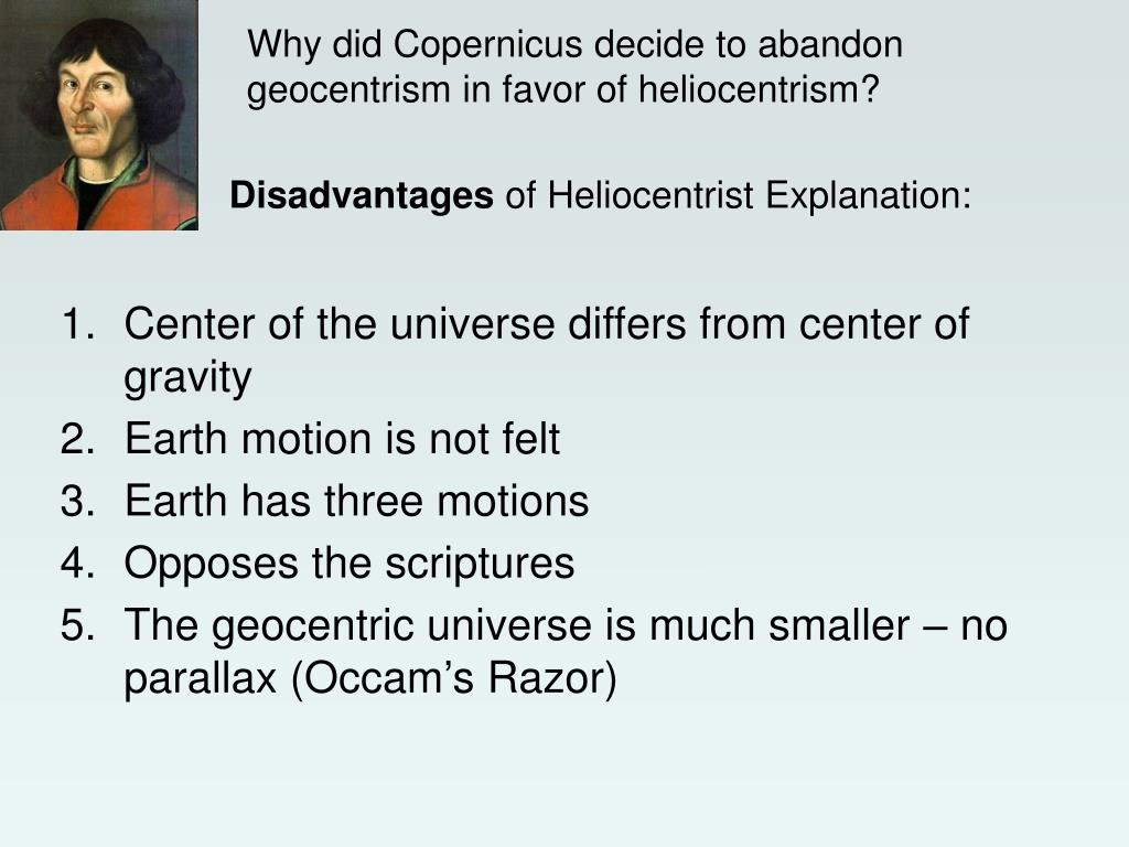 Why did Copernicus decide to abandon geocentrism in favor of heliocentrism? Disadvantages of Heliocentrist Explanation: Center of the universe differs from center of gravity Earth motion is not felt Earth has three motions Opposes the scriptures The geocentric universe is much smaller – no parallax (Occam’s Razor)