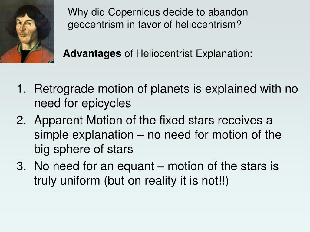 Why did Copernicus decide to abandon geocentrism in favor of heliocentrism? Advantages of Heliocentrist Explanation: Retrograde motion of planets is explained with no need for epicycles Apparent Motion of the fixed stars receives a simple explanation – no need for motion of the big sphere of stars No need for an equant – motion of the stars is truly uniform (but on reality it is not!!)