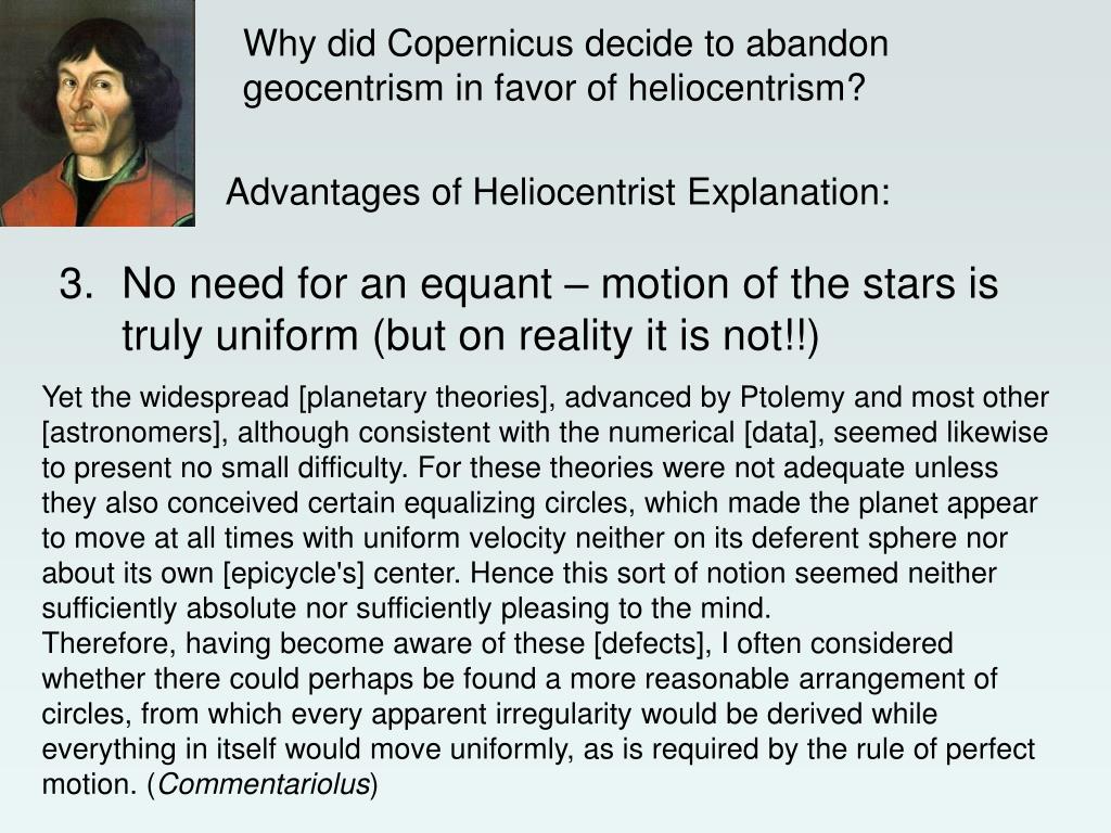 Why did Copernicus decide to abandon geocentrism in favor of heliocentrism? Advantages of Heliocentrist Explanation: No need for an equant – motion of the stars is truly uniform (but on reality it is not!!) Yet the widespread [planetary theories], advanced by Ptolemy and most other [astronomers], although consistent with the numerical [data], seemed likewise to present no small difficulty. For these theories were not adequate unless they also conceived certain equalizing circles, which made the planet appear to move at all times with uniform velocity neither on its deferent sphere nor about its own [epicycle's] center. Hence this sort of notion seemed neither sufficiently absolute nor sufficiently pleasing to the mind. Therefore, having become aware of these [defects], I often considered whether there could perhaps be found a more reasonable arrangement of circles, from which every apparent irregularity would be derived while everything in itself would move uniformly, as is required by the rule of perfect motion. (Commentariolus)