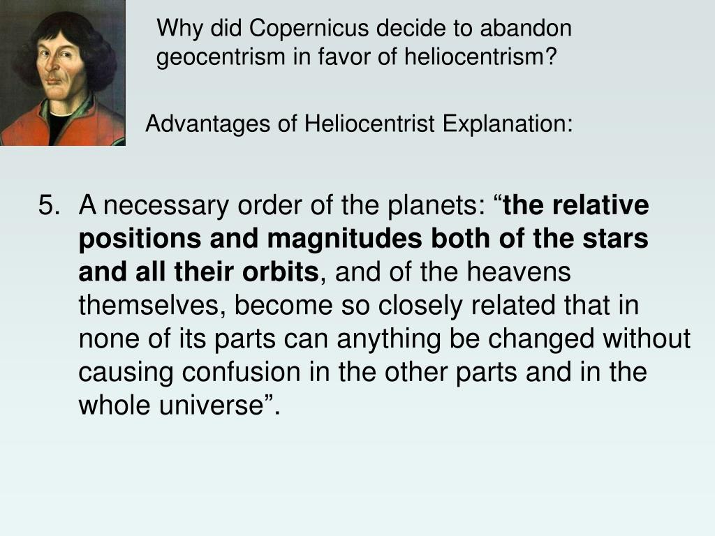 Why did Copernicus decide to abandon geocentrism in favor of heliocentrism? Advantages of Heliocentrist Explanation: A necessary order of the planets: “the relative positions and magnitudes both of the stars and all their orbits, and of the heavens themselves, become so closely related that in none of its parts can anything be changed without causing confusion in the other parts and in the whole universe”.