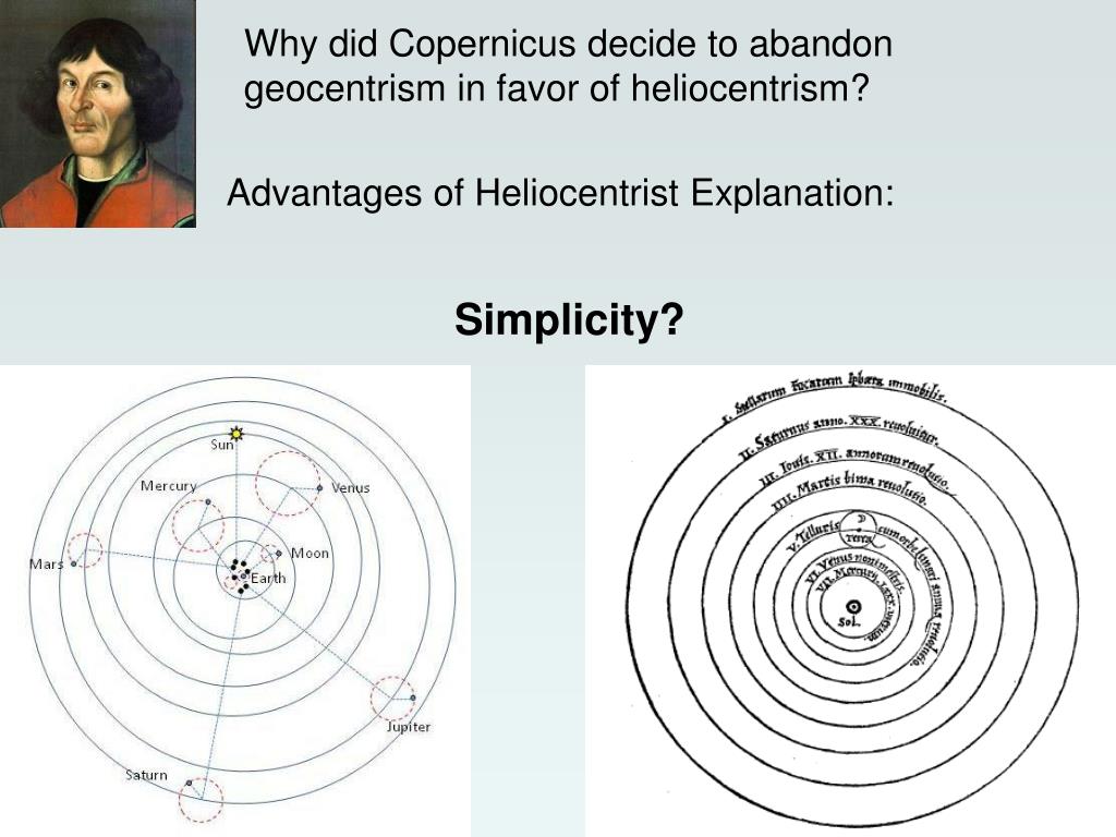 Why did Copernicus decide to abandon geocentrism in favor of heliocentrism? Advantages of Heliocentrist Explanation: Simplicity?
