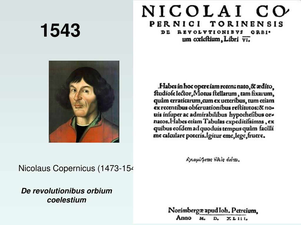 1543 Nicolaus Copernicus (1473-1543) De revolutionibusorbiumcoelestium Andreas Vesalius (1514-1564) De humanicorporisfabrica