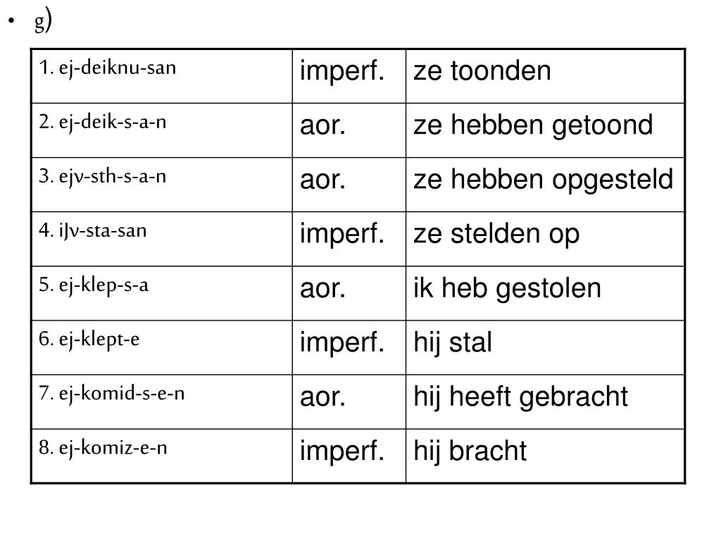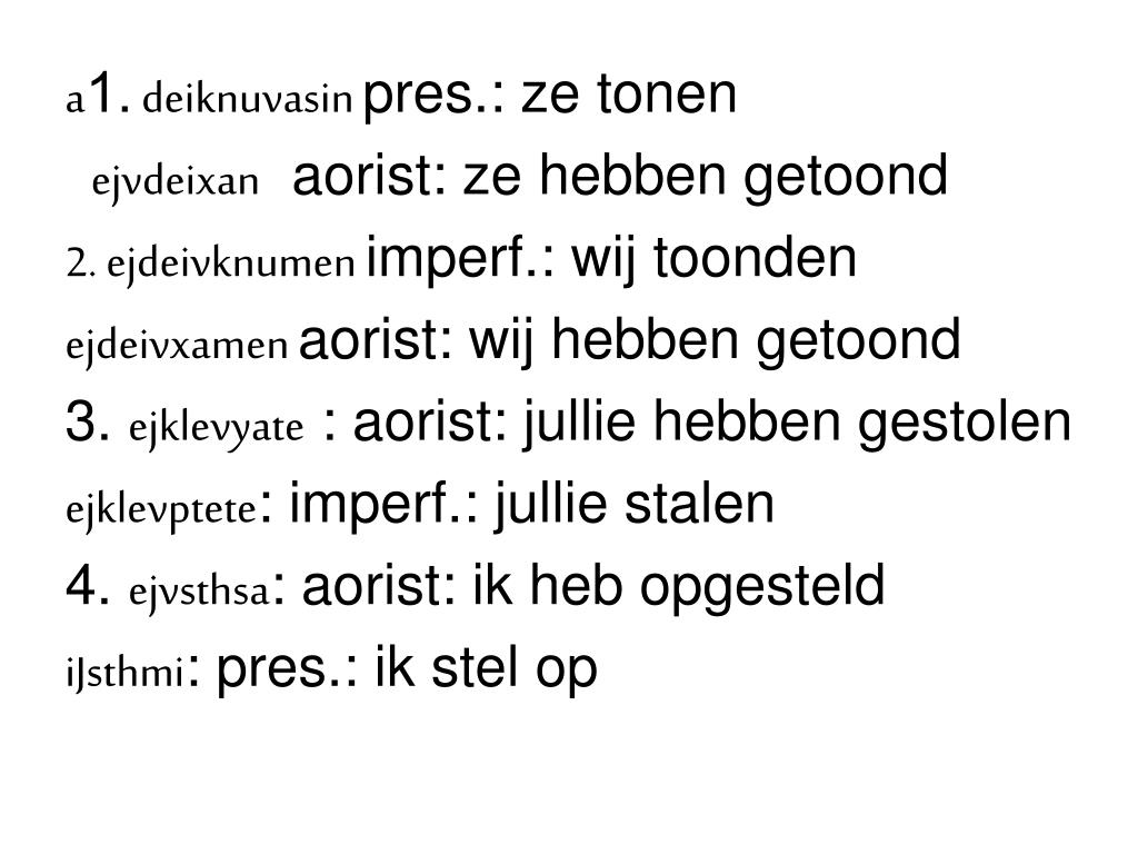 a1. deiknuvasin pres.: ze tonen ejvdeixan aorist: ze hebben getoond 2. ejdeivknumen imperf.: wij toonden ejdeivxamen aorist: wij hebben getoond 3. ejklevyate : aorist: jullie hebben gestolen ejklevptete: imperf.: jullie stalen 4. ejvsthsa: aorist: ik heb opgesteld iJsthmi: pres.: ik stel op