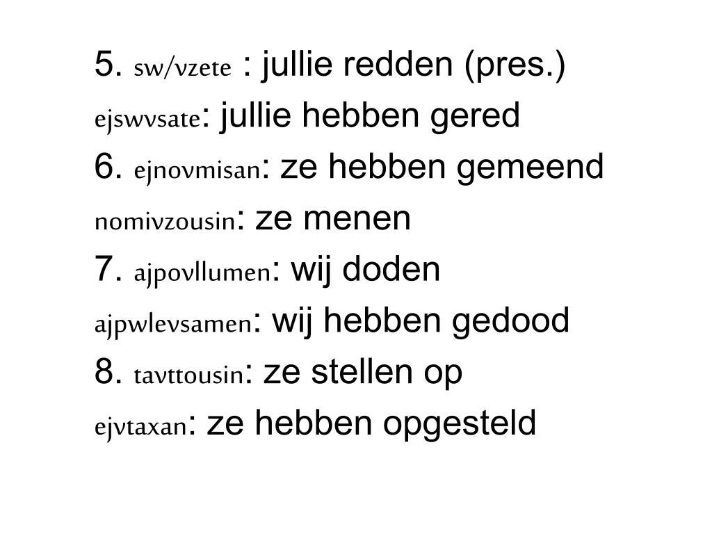 5. sw/vzete : jullie redden (pres.) ejswvsate: jullie hebben gered 6. ejnovmisan: ze hebben gemeend nomivzousin: ze menen 7. ajpovllumen: wij doden ajpwlevsamen: wij hebben gedood 8. tavttousin: ze stellen op ejvtaxan: ze hebben opgesteld