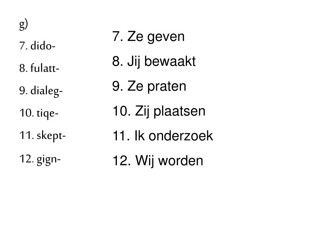 7. Ze geven 8. Jij bewaakt 9. Ze praten 10. Zij plaatsen 11. Ik onderzoek 12. Wij worden g) 7. dido- 8. fulatt- 9. dialeg- 10. tiqe- 11. skept- 12. gign-
