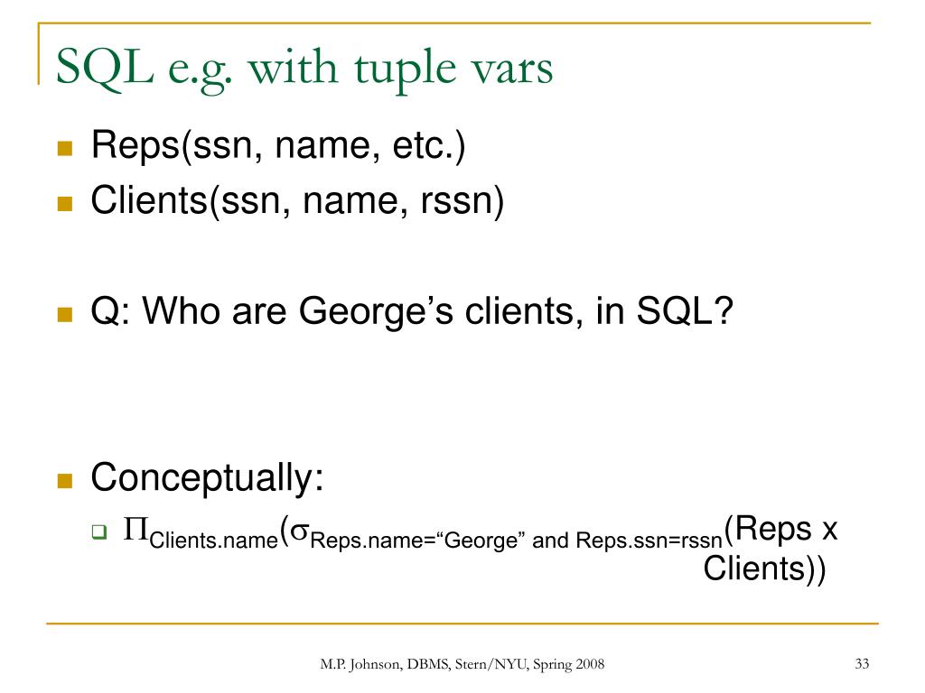 SQL e.g. with tuple vars • Reps(ssn, name, etc.) • Clients(ssn, name, rssn) • Q: Who are George’s clients, in SQL? • Conceptually: • PClients.name(sReps.name=“George” and Reps.ssn=rssn(Reps x Clients)) M.P. Johnson, DBMS, Stern/NYU, Spring 2008