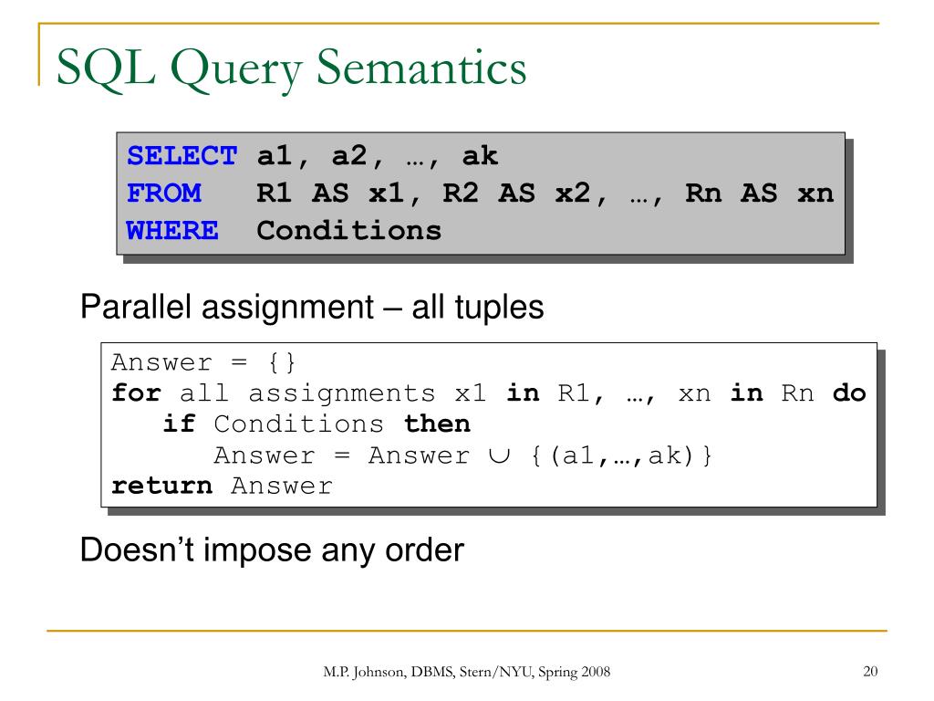 SQL Query Semantics Parallel assignment – all tuples Doesn’t impose any order SELECT a1, a2, …, ak FROM R1 AS x1, R2 AS x2, …, Rn AS xn WHERE Conditions Answer = {} for all assignments x1 in R1, …, xn in Rn do if Conditions then Answer = Answer {(a1,…,ak)} return Answer M.P. Johnson, DBMS, Stern/NYU, Spring 2008