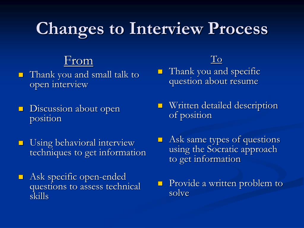 From Thank you and small talk to open interview Discussion about open position Using behavioral interview techniques to get information Ask specific open-ended questions to assess technical skills To Thank you and specific question about resume Written detailed description of position Ask same types of questions using the Socratic approach to get information Provide a written problem to solve Changes to Interview Process