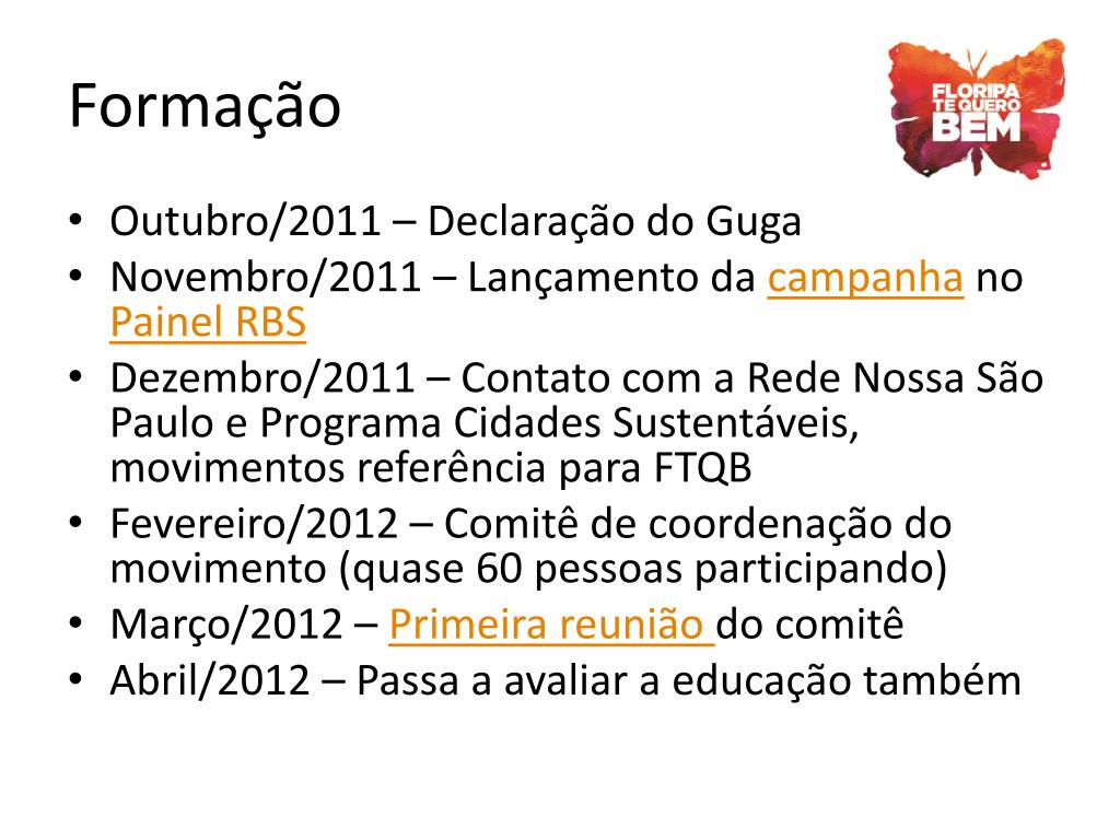 Formação • Outubro/2011 – Declaração do Guga • Novembro/2011 – Lançamento da campanha no Painel RBS • Dezembro/2011 – Contato com a Rede Nossa São Paulo e Programa Cidades Sustentáveis, movimentos referência para FTQB • Fevereiro/2012 – Comitê de coordenação do movimento (quase 60 pessoas participando) • Março/2012 – Primeira reunião do comitê • Abril/2012 – Passa a avaliar a educação também