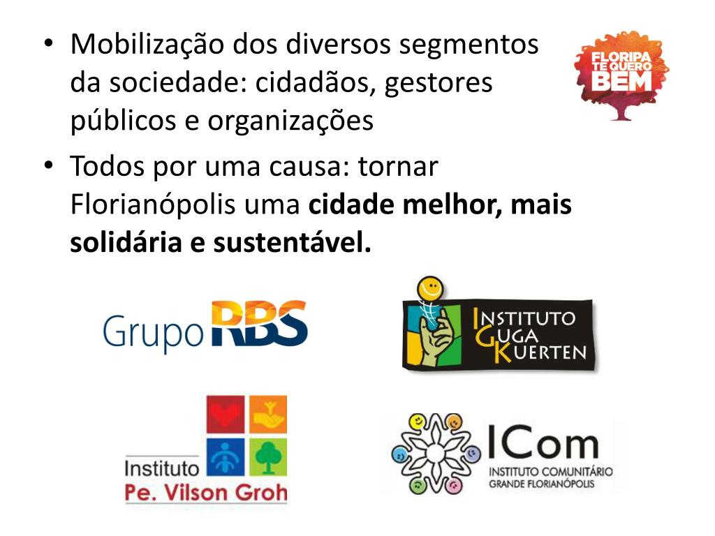 Mobilização dos diversos segmentos da sociedade: cidadãos, gestores públicos e organizações • Todos por uma causa: tornar Florianópolis uma cidade melhor, mais solidária e sustentável.