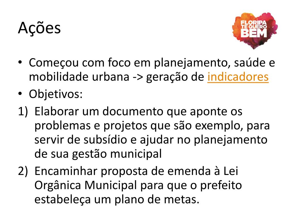 Ações • Começou com foco em planejamento, saúde e mobilidade urbana -> geração de indicadores • Objetivos: • Elaborar um documento que aponte os problemas e projetos que são exemplo, para servir de subsídio e ajudar no planejamento de sua gestão municipal • Encaminhar proposta de emenda à Lei Orgânica Municipal para que o prefeito estabeleça um plano de metas.