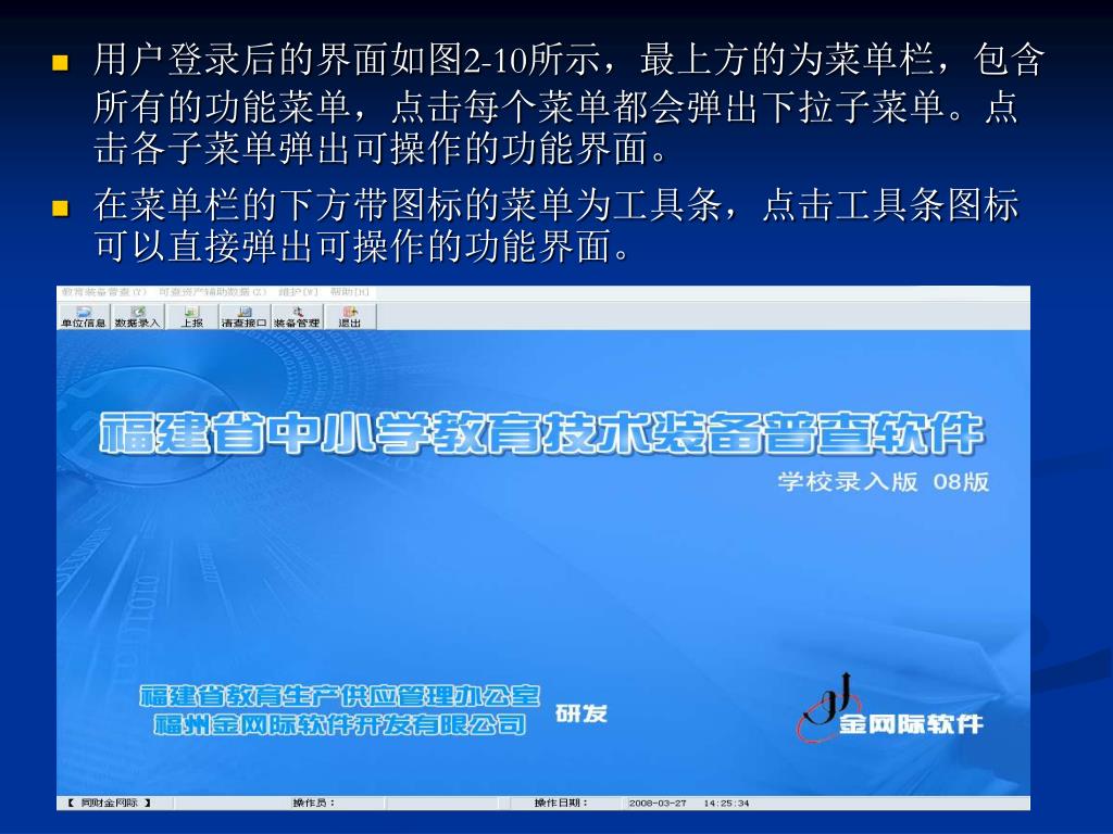 福建省中小学教育装备普查软件使用培训. 学校录入版操作流程. 下载并安装软件 学校基本信息录入 教育装备数据录入 装备查询确定无误 主管审核 数据上报 报表打印. 软件安装与界面. 1.下载软件 从教育装备网( http://www.fjeei.com )的 “ 下载专区 ” 栏目下载学校版软件并解压. 2.在压缩文件夹内找到教育装备普查安装程序(学校版) .EXE 文件,双击它进行安装,. 软件安装与界面. 点击 “ NEXT ” 进行下一步安装步骤 按照提示一步一步执行即可。 注:安装完软件第一次打开软件时会弹出如下对话框.