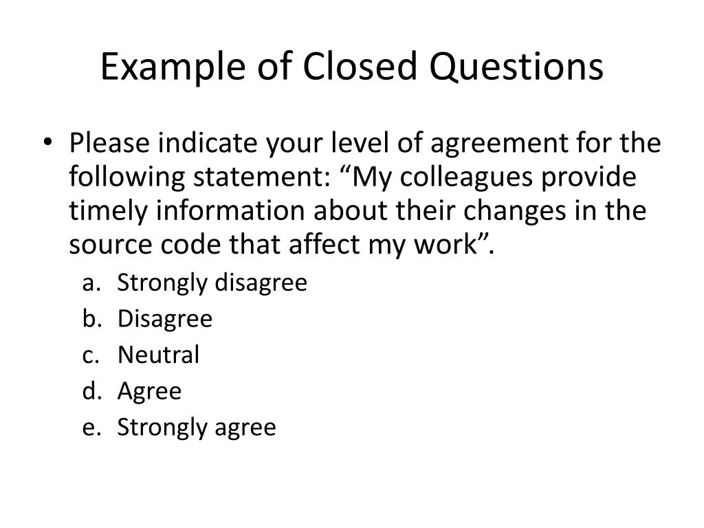 ExampleofClosedQuestions • Please indicate your level of agreement for the following statement: “My colleagues provide timely information about their changes in the source code that affect my work”. • Strongly disagree • Disagree • Neutral • Agree • Strongly agree