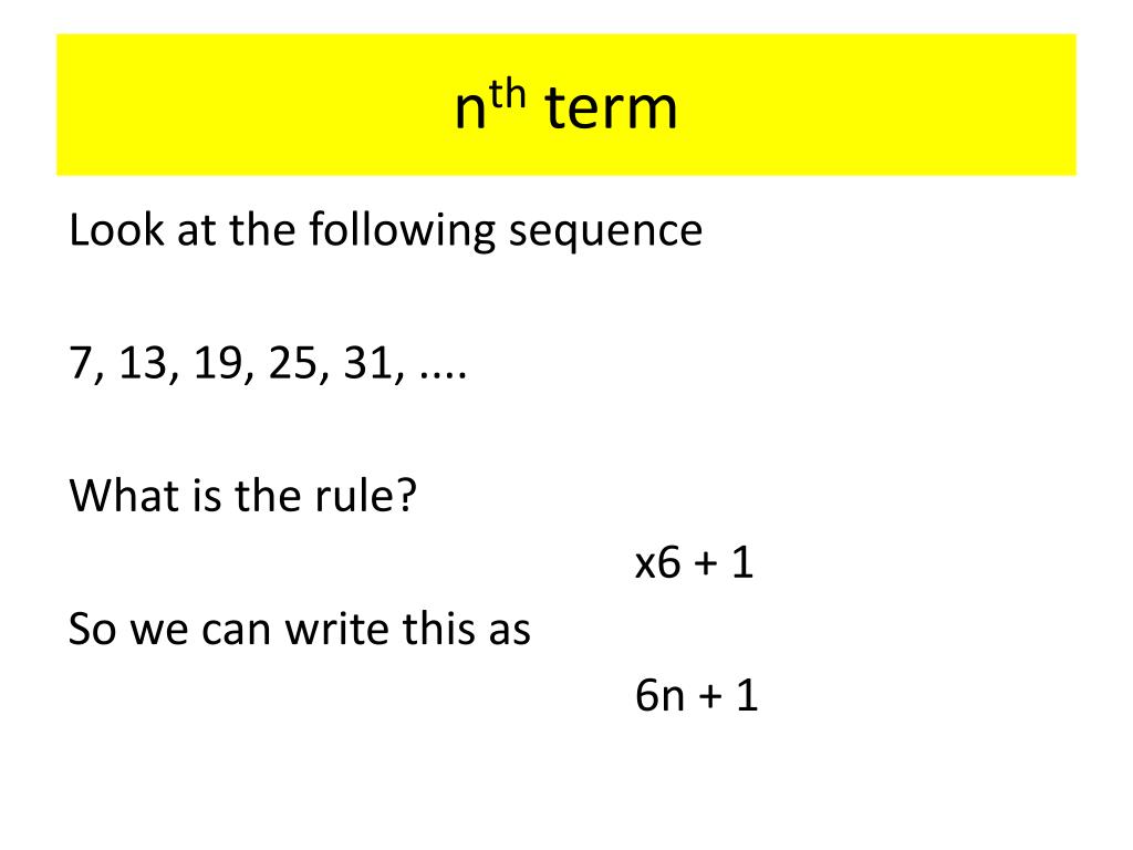 nth term Look at the following sequence 7, 13, 19, 25, 31, .... What is the rule? x6 + 1 So we can write this as 6n + 1