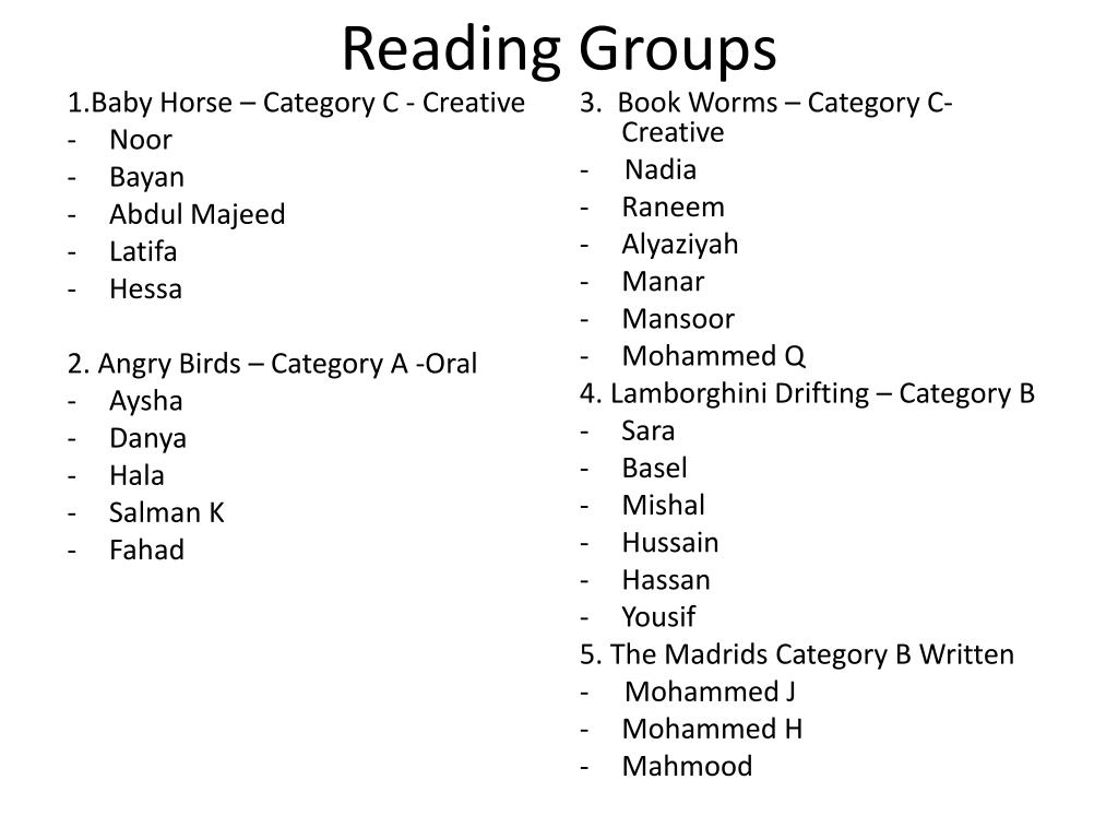 Reading Groups 1.Baby Horse – Category C - Creative • Noor • Bayan • Abdul Majeed • Latifa • Hessa 2. Angry Birds – Category A -Oral • Aysha • Danya • Hala • Salman K • Fahad 3. Book Worms – Category C- Creative - Nadia • Raneem • Alyaziyah • Manar • Mansoor • Mohammed Q 4. Lamborghini Drifting – Category B • Sara • Basel • Mishal • Hussain • Hassan • Yousif 5. The Madrids Category B Written - Mohammed J • Mohammed H • Mahmood