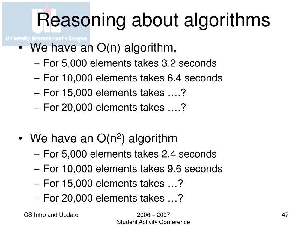 Reasoning about algorithms • We have an O(n) algorithm, • For 5,000 elements takes 3.2 seconds • For 10,000 elements takes 6.4 seconds • For 15,000 elements takes ….? • For 20,000 elements takes ….? • We have an O(n2) algorithm • For 5,000 elements takes 2.4 seconds • For 10,000 elements takes 9.6 seconds • For 15,000 elements takes …? • For 20,000 elements takes …? 2006 – 2007Student Activity Conference