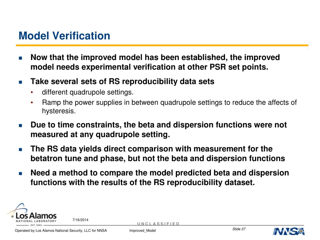 Model Verification • Now that the improved model has been established, the improved model needs experimental verification at other PSR set points. • Take several sets of RS reproducibility data sets • different quadrupole settings. • Ramp the power supplies in between quadrupole settings to reduce the affects of hysteresis. • Due to time constraints, the beta and dispersion functions were not measured at any quadrupole setting. • The RS data yields direct comparison with measurement for the betatron tune and phase, but not the beta and dispersion functions • Need a method to compare the model predicted beta and dispersion functions with the results of the RS reproducibility dataset. Improved_Model