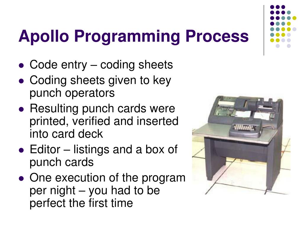 Apollo Programming Process • Code entry – coding sheets • Coding sheets given to key punch operators • Resulting punch cards were printed, verified and inserted into card deck • Editor – listings and a box of punch cards • One execution of the program per night – you had to be perfect the first time