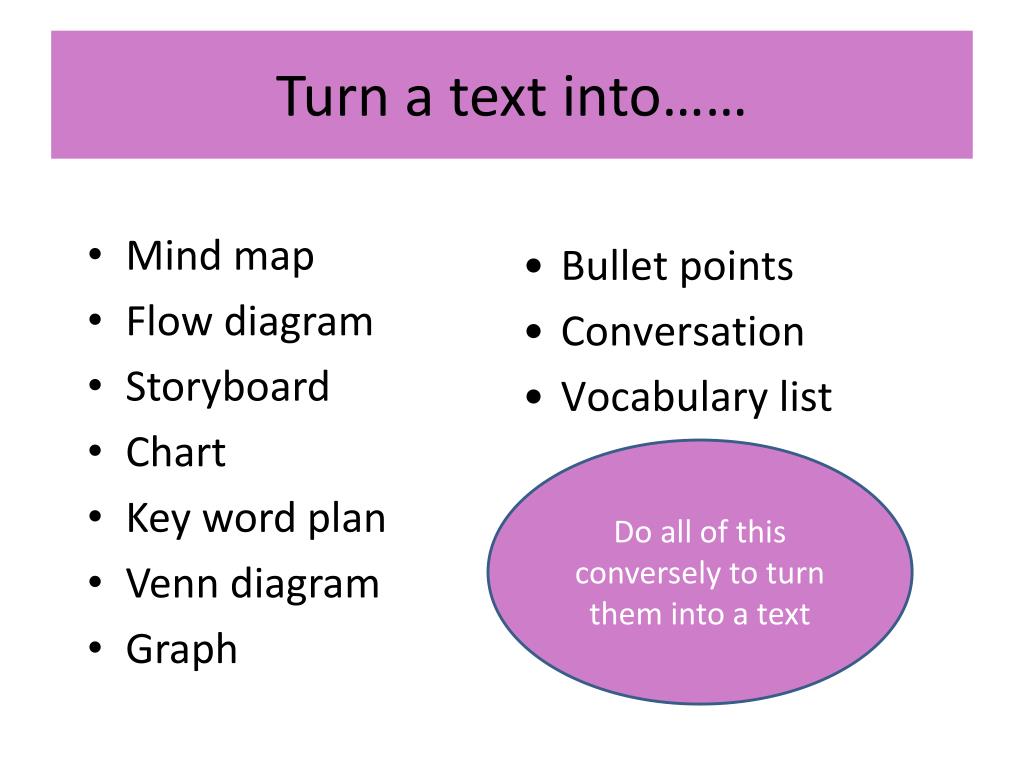 Turn a text into…… • Bullet points • Conversation • Vocabulary list Do all of this conversely to turn them into a text Mind map Flow diagram Storyboard Chart Key word plan Venn diagram Graph