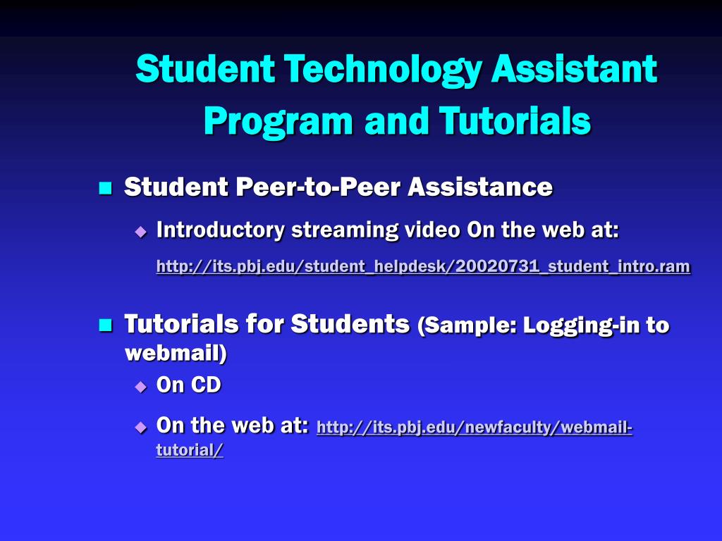 Student Technology Assistant Programand Tutorials • Student Peer-to-Peer Assistance • Introductory streaming video On the web at:http://its.pbj.edu/student_helpdesk/20020731_student_intro.ram • Tutorials for Students(Sample: Logging-in to webmail) • On CD • On the web at:http://its.pbj.edu/newfaculty/webmail-tutorial/