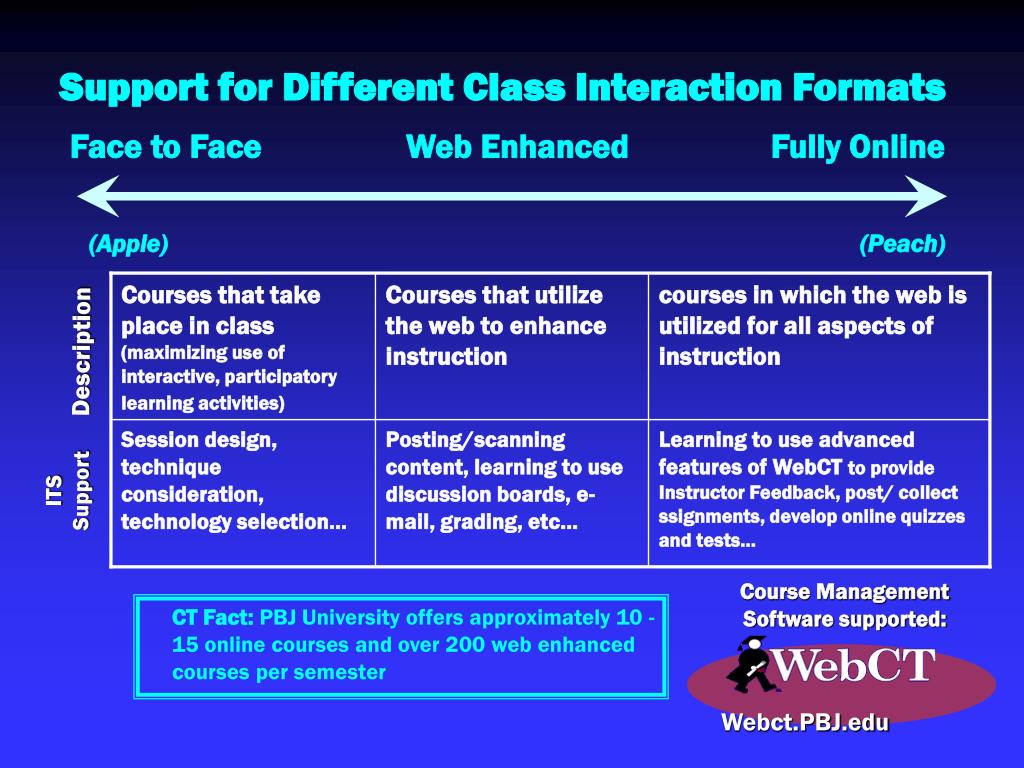 Courses that take place in class (maximizing use of interactive, participatory learning activities) Courses that utilize the web to enhance instruction courses in which the web is utilized for all aspects of instruction Description Session design, technique consideration, technology selection… Posting/scanning content, learning to use discussion boards, e-mail, grading, etc… Learning to use advanced features of WebCT to provide Instructor Feedback, post/ collect ssignments, develop online quizzes and tests… ITS Support Webct.PBJ.edu Support for Different Class Interaction Formats Face to Face Web Enhanced Fully Online (Apple) (Peach) Course Management Software supported: CT Fact: PBJ University offers approximately 10 -15 online courses and over 200 web enhanced courses per semester