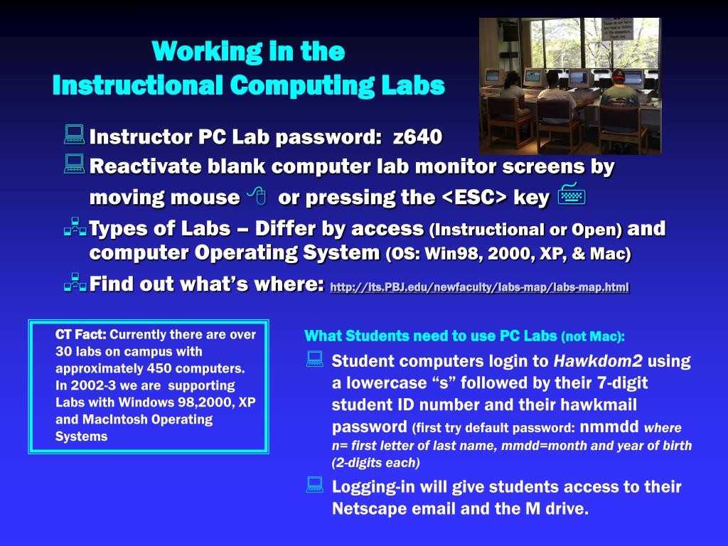 Working in theInstructional Computing Labs • Instructor PC Lab password: z640 • Reactivate blank computer lab monitor screens by moving mouse or pressing the <ESC> key • Types of Labs – Differ by access (Instructional or Open) and computer Operating System (OS: Win98, 2000, XP, & Mac) • Find out what’s where:http://its.PBJ.edu/newfaculty/labs-map/labs-map.html CT Fact: Currently there are over 30 labs on campus with approximately 450 computers. In 2002-3 we are supporting Labs with Windows 98,2000, XP and MacIntosh Operating Systems What Students need to use PC Labs (not Mac): • Student computers login to Hawkdom2 using a lowercase “s” followed by their 7-digit student ID number and their hawkmail password (first try default password: nmmdd where n= first letter of last name, mmdd=month and year of birth (2-digits each) • Logging-in will give students access to their Netscape email and the M drive.