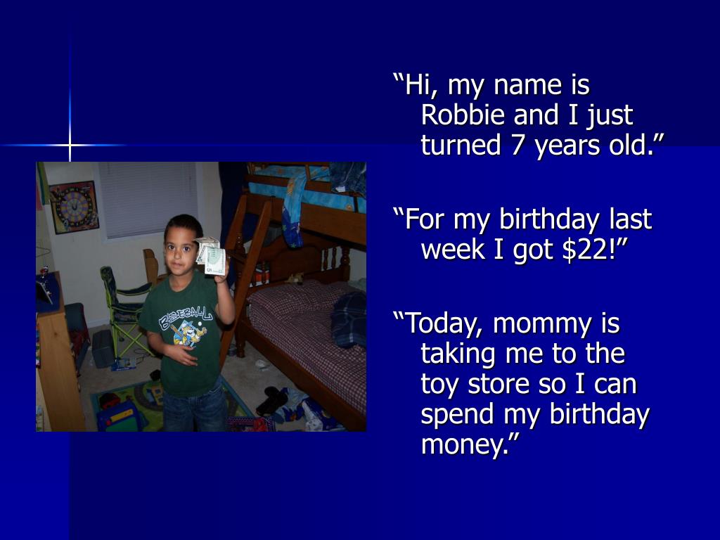 “Hi, my name is Robbie and I just turned 7 years old.” “For my birthday last week I got $22!” “Today, mommy is taking me to the toy store so I can spend my birthday money.”