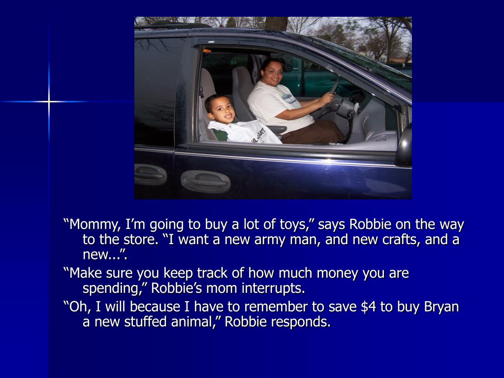 “Mommy, I’m going to buy a lot of toys,” says Robbie on the way to the store. “I want a new army man, and new crafts, and a new...”. “Make sure you keep track of how much money you are spending,” Robbie’s mom interrupts. “Oh, I will because I have to remember to save $4 to buy Bryan a new stuffed animal,” Robbie responds.