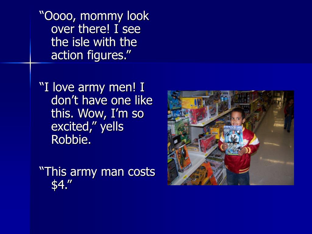 “Oooo, mommy look over there! I see the isle with the action figures.” “I love army men! I don’t have one like this. Wow, I’m so excited,” yells Robbie. “This army man costs $4.”