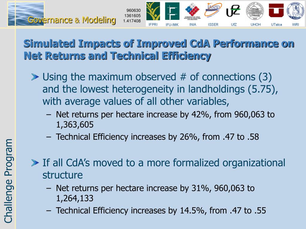 Simulated Impacts of Improved CdA Performance on Net Returns and Technical Efficiency • Using the maximum observed # of connections (3) and the lowest heterogeneity in landholdings (5.75), with average values of all other variables, • Net returns per hectare increase by 42%, from 960,063 to 1,363,605 • Technical Efficiency increases by 26%, from .47 to .58 • If all CdA’s moved to a more formalized organizational structure • Net returns per hectare increase by 31%, 960,063 to 1,264,133 • Technical Efficiency increases by 14.5%, from .47 to .55