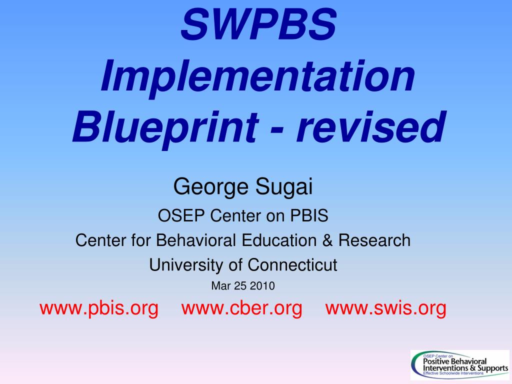 SWPBS Implementation Blueprint - revised. George Sugai OSEP Center on PBIS Center for Behavioral Education & Research University of Connecticut Mar 25 2010 www.pbis.org www.cber.org www.swis. org. PURPOSE