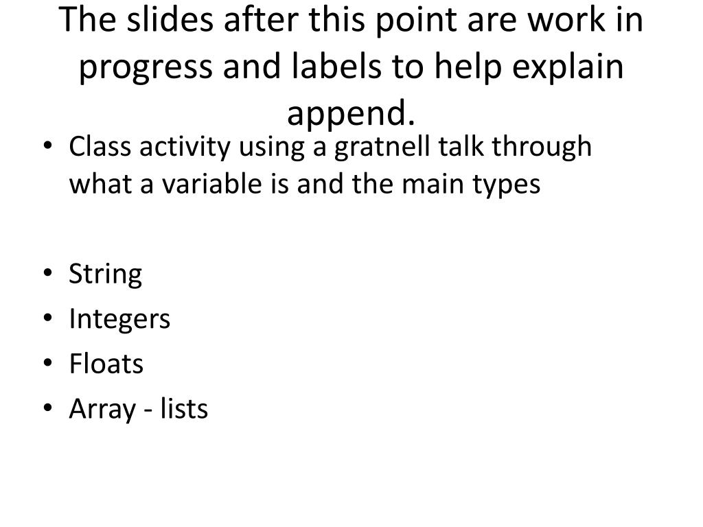 The slides after this point are work in progress and labels to help explain append. • Class activity using a gratnell talk through what a variable is and the main types • String • Integers • Floats • Array - lists
