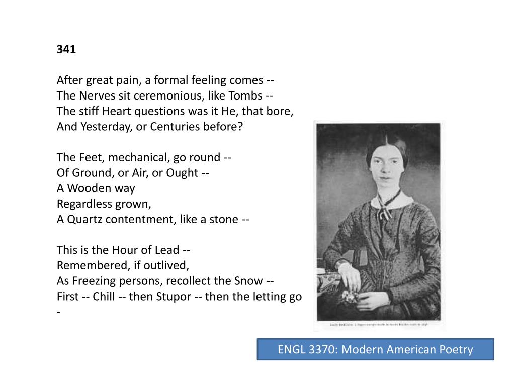 341 After great pain, a formal feeling comes -- The Nerves sit ceremonious, like Tombs -- The stiff Heart questions was it He, that bore, And Yesterday, or Centuries before? The Feet, mechanical, go round -- Of Ground, or Air, or Ought -- A Wooden way Regardless grown, A Quartz contentment, like a stone -- This is the Hour of Lead -- Remembered, if outlived, As Freezing persons, recollect the Snow -- First -- Chill -- then Stupor -- then the letting go - ENGL 3370: Modern American Poetry