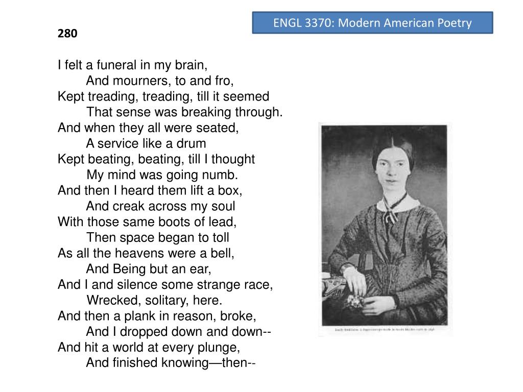 ENGL 3370: Modern American Poetry 280 I felt a funeral in my brain, And mourners, to and fro,Kept treading, treading, till it seemed That sense was breaking through. And when they all were seated, A service like a drumKept beating, beating, till I thought My mind was going numb. And then I heard them lift a box, And creak across my soulWith those same boots of lead, Then space began to toll As all the heavens were a bell, And Being but an ear,And I and silence some strange race, Wrecked, solitary, here. And then a plank in reason, broke, And I dropped down and down--And hit a world at every plunge, And finished knowing—then--