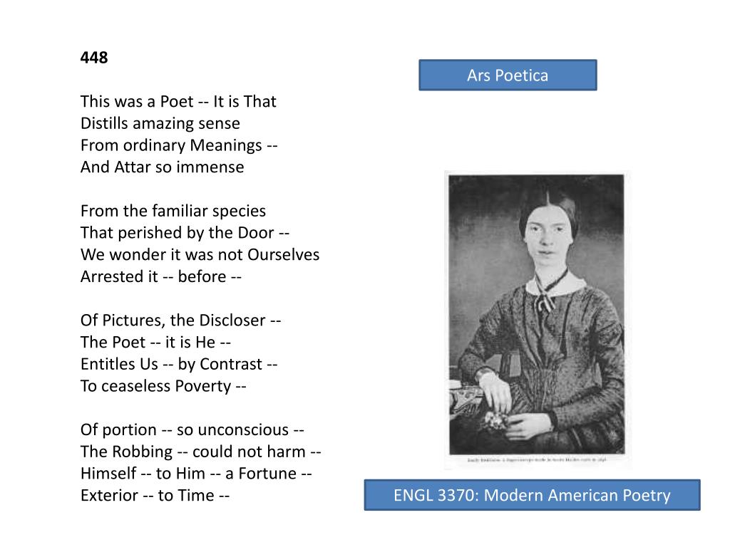 448 This was a Poet -- It is That Distills amazing sense From ordinary Meanings -- And Attar so immense From the familiar species That perished by the Door -- We wonder it was not Ourselves Arrested it -- before -- Of Pictures, the Discloser -- The Poet -- it is He -- Entitles Us -- by Contrast -- To ceaseless Poverty -- Of portion -- so unconscious -- The Robbing -- could not harm -- Himself -- to Him -- a Fortune -- Exterior -- to Time -- ArsPoetica ENGL 3370: Modern American Poetry