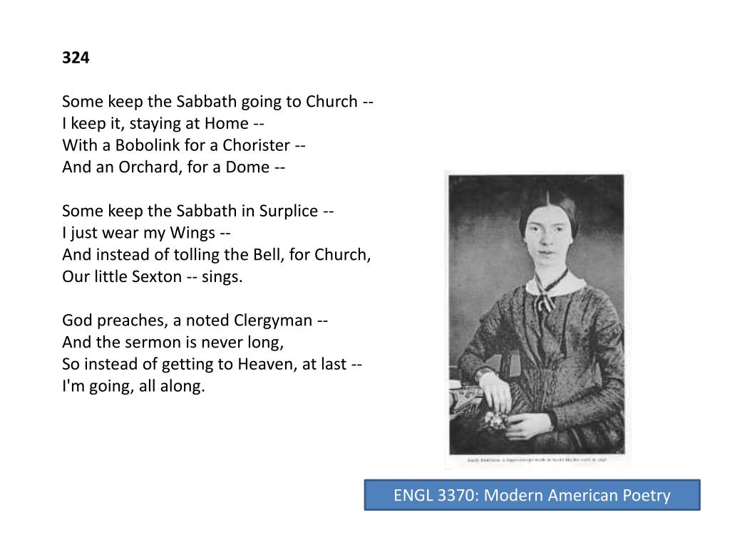 324 Some keep the Sabbath going to Church -- I keep it, staying at Home -- With a Bobolink for a Chorister -- And an Orchard, for a Dome -- Some keep the Sabbath in Surplice -- I just wear my Wings -- And instead of tolling the Bell, for Church, Our little Sexton -- sings. God preaches, a noted Clergyman -- And the sermon is never long, So instead of getting to Heaven, at last -- I'm going, all along. ENGL 3370: Modern American Poetry