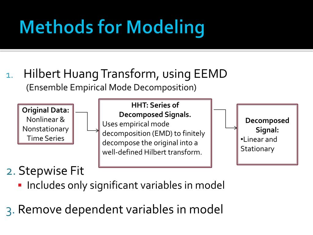 Methods for Modeling • Hilbert Huang Transform, using EEMD (Ensemble Empirical Mode Decomposition) 2. Stepwise Fit • Includes only significant variables in model 3. Remove dependent variables in model HHT: Series of Decomposed Signals. Uses empirical mode decomposition (EMD) to finitely decompose the original into a well-defined Hilbert transform. Original Data: Nonlinear & Nonstationary Time Series • Decomposed Signal: • Linear and Stationary