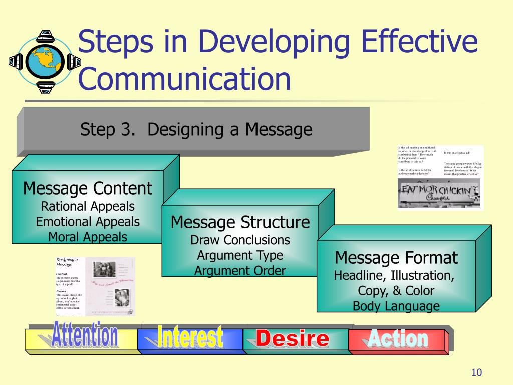 Step 3. Designing a Message Attention Interest Desire Action Steps in Developing Effective Communication Message Content Rational Appeals Emotional Appeals Moral Appeals Message Structure Draw Conclusions Argument Type Argument Order Message Format Headline, Illustration, Copy, & Color Body Language