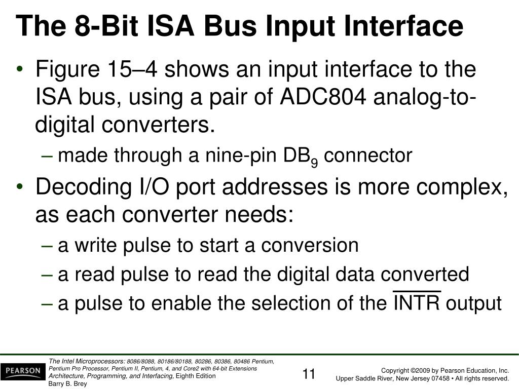 The 8-Bit ISA Bus Input Interface • Figure 15–4 shows an input interface to the ISA bus, using a pair of ADC804 analog-to-digital converters. • made through a nine-pin DB9 connector • Decoding I/O port addresses is more complex, as each converter needs: • a write pulse to start a conversion • a read pulse to read the digital data converted • a pulse to enable the selection of the INTR output