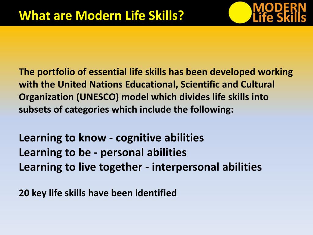 The portfolio of essential life skills has been developed working with the United Nations Educational, Scientific and Cultural Organization (UNESCO) model which divides life skills into subsets of categories which include the following: • Learning to know - cognitive abilities • Learning to be - personal abilities • Learning to live together - interpersonal abilities • 20 key life skills have been identified What are Modern Life Skills?