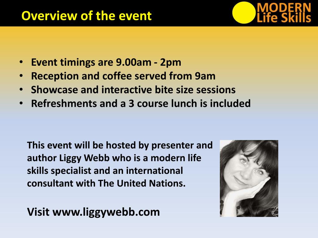 Event timings are 9.00am - 2pm • Reception and coffee served from 9am • Showcase and interactive bite size sessions • Refreshments and a 3 course lunch is included Overview of the event This event will be hosted by presenter and author Liggy Webb who is a modern life skills specialist and an international consultant with The United Nations. Visit www.liggywebb.com