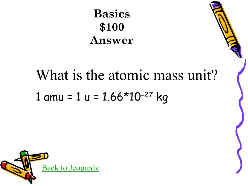 Basics $100Answer What is the atomic mass unit? 1 amu = 1 u = 1.66*10-27 kg Back to Jeopardy