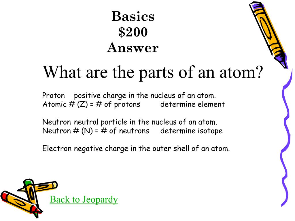Basics $200Answer What are the parts of an atom? Proton positive charge in the nucleus of an atom. Atomic # (Z) = # of protons determine element Neutron neutral particle in the nucleus of an atom. Neutron # (N) = # of neutrons determine isotope Electron negative charge in the outer shell of an atom. Back to Jeopardy