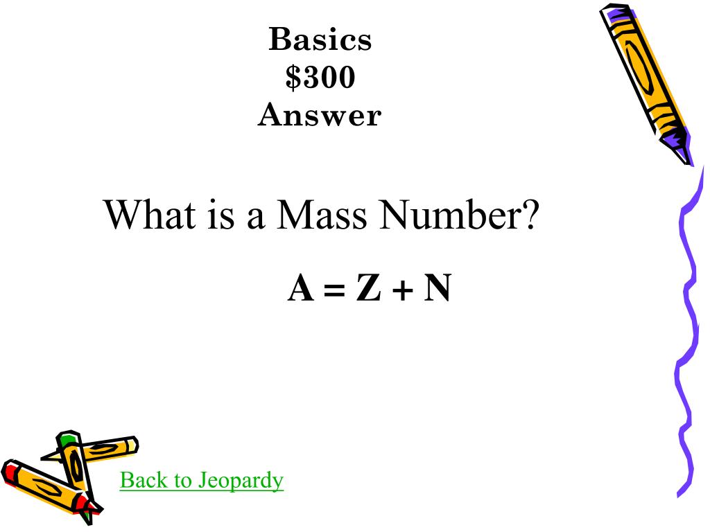 Basics $300Answer What is a Mass Number? A = Z + N Back to Jeopardy