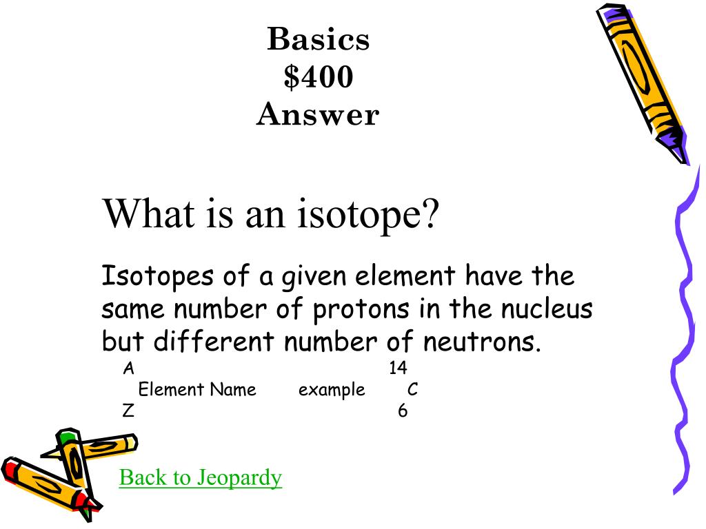 Basics $400Answer What is an isotope? Isotopes of a given element have the same number of protons in the nucleus but different number of neutrons. A 14 Element Name example C Z 6 Back to Jeopardy