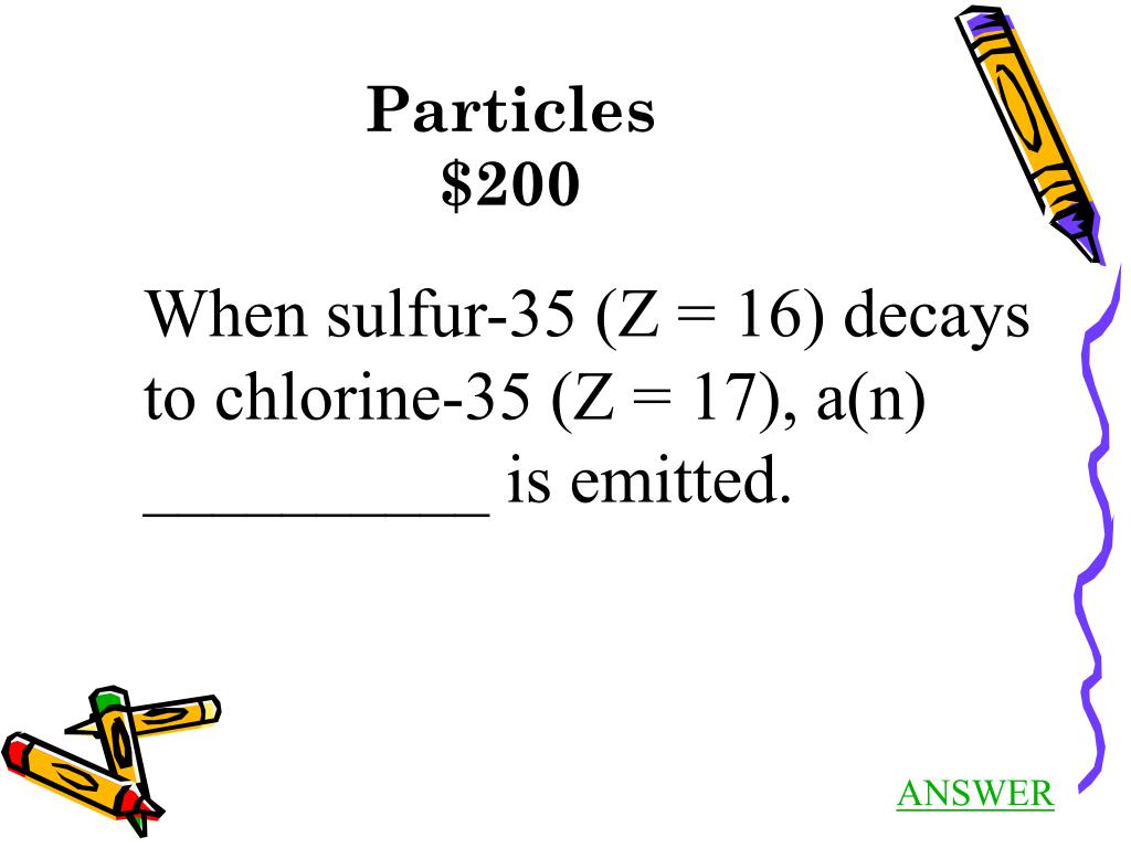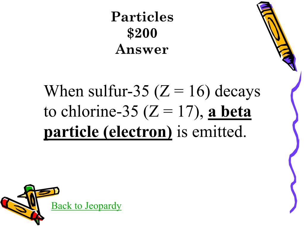 Particles$200Answer When sulfur-35 (Z = 16) decays to chlorine-35 (Z = 17), a beta particle (electron) is emitted. Back to Jeopardy