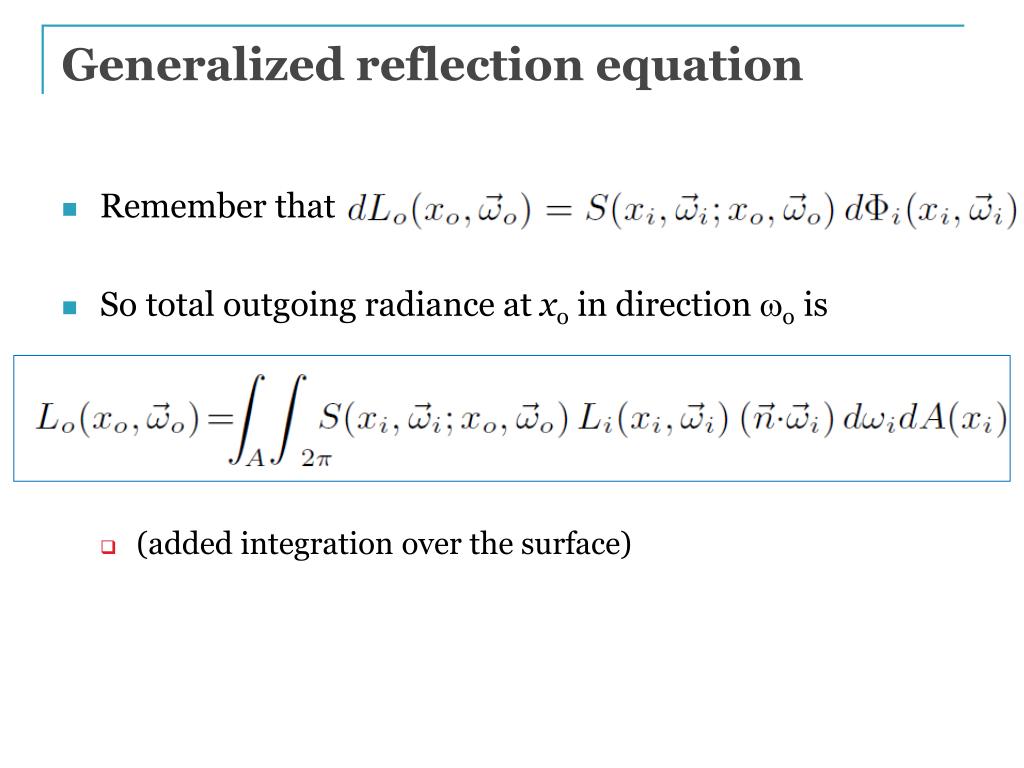 Generalized reflection equation • Remember that • So total outgoing radiance at xo in direction wo is • (added integration over the surface)